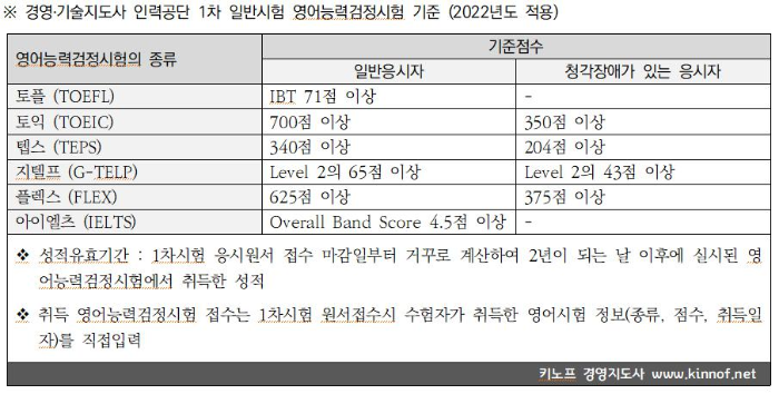영어시험 대신에 영어능력검정시험 점수를 제출하는 것인데요. 시험의 종류 및 기준은 다음과 같습니다.