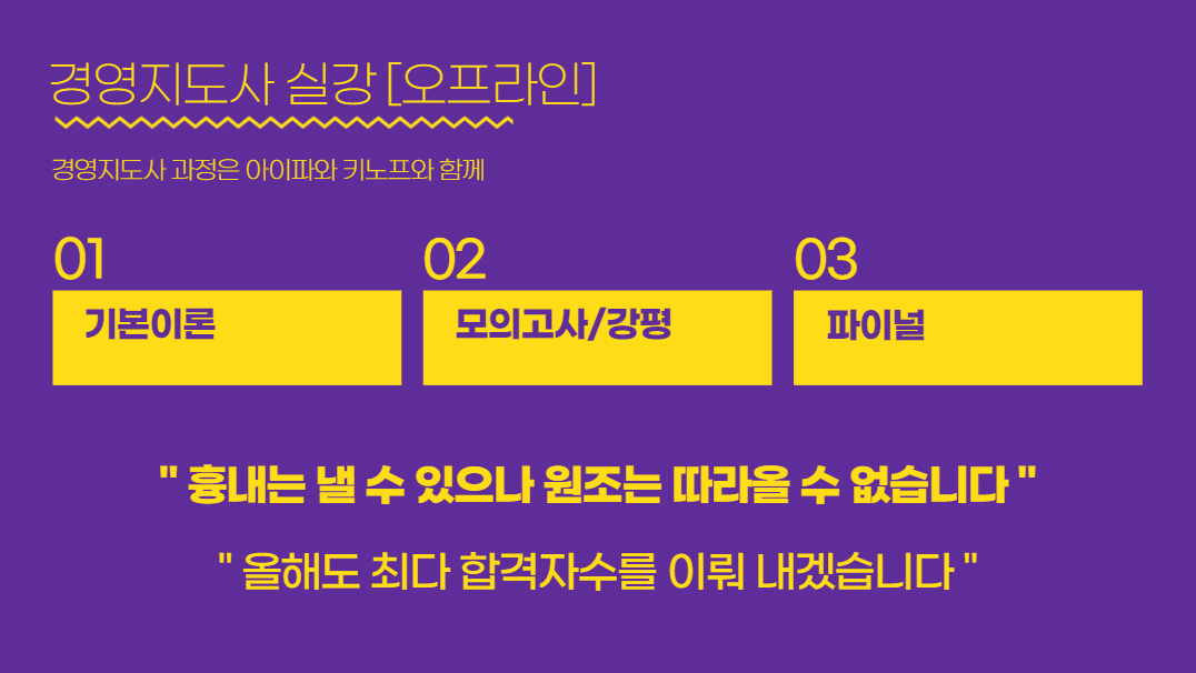 지도사법이 제정된 후 교육기관들이 하나둘 경영지도사에 대해 관심을 보이고 있는데요. 이제막 과정을 런칭하는 학원에서 키노프-아이파 만의 교육시스템을, 심지어 "기본이론-모의고사-파이널" 의 명칭까지 그대로 모방하는 사례가 있었습니다. 그만큼 키노프-아이파의 경영지도사 교육과정이 최적화되었다라는 반증의 의미도 될 것 같습니다.