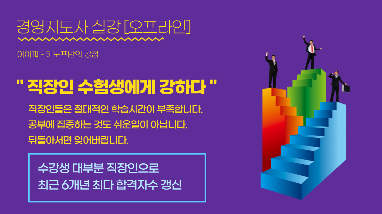 지도사법이 제정된 후 교육기관들이 하나둘 경영지도사에 대해 관심을 보이고 있는데요. 이제막 과정을 런칭하는 학원에서 키노프-아이파 만의 교육시스템을, 심지어 "기본이론-모의고사-파이널" 의 명칭까지 그대로 모방하는 사례가 있었습니다. 그만큼 키노프-아이파의 경영지도사 교육과정이 최적화되었다라는 반증의 의미도 될 것 같습니다.