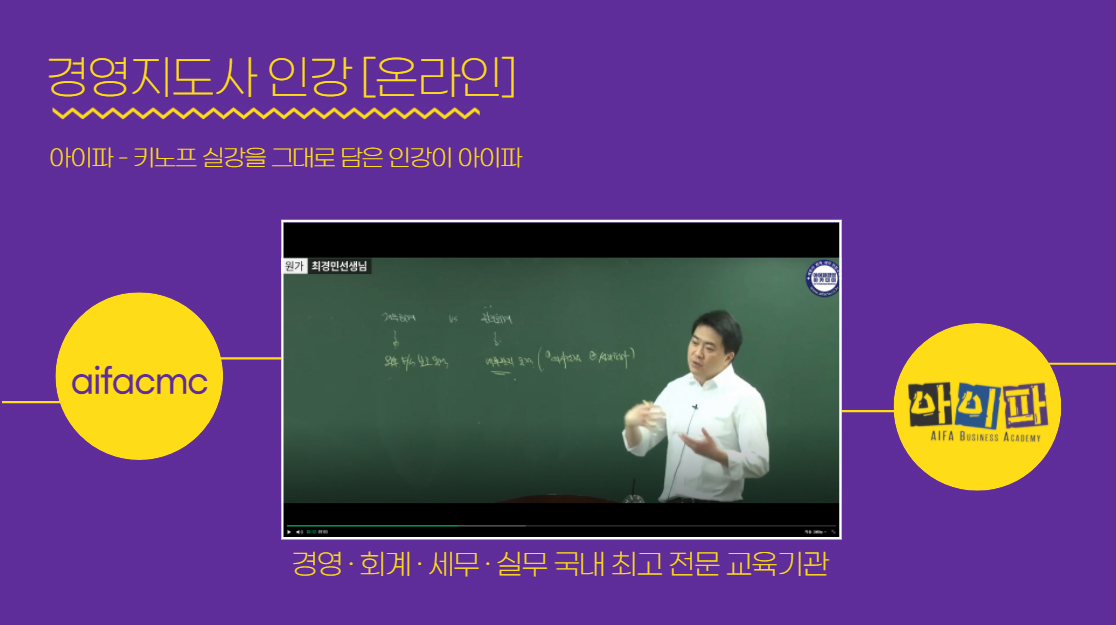 키노프-아이파 경영지도사 2차 오프라인 실강이 바로 아이파 인강입니다. 오프라인 강의를 그대로 촬영한 강의이기 때문에 온라인, 오프라인 수업은 동일하며 수업 전체에 대해 매년 한번씩 정기적인 업데이트가 진행되므로 매년 최신 기출문제가 반영된 새로운강의를 만나보실 수 있습니다.